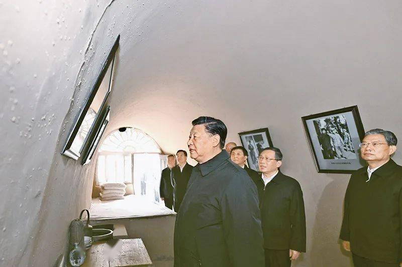 2022年10月27日,中共中央总书记、国家主席、中央军委主席习近平带领中共中央政治局常委李强、赵乐际、王沪宁、蔡奇、丁薛祥、李希,瞻仰延安革命纪念地。这是习近平等在杨家岭参观朱德旧居。 新华社记者 燕雁/摄